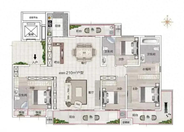212.36㎡的户型在空间分配上兼顾了居住实用性与生活情趣,四卧室的配置满足多人口家庭需求,细节设计更显巧思。
